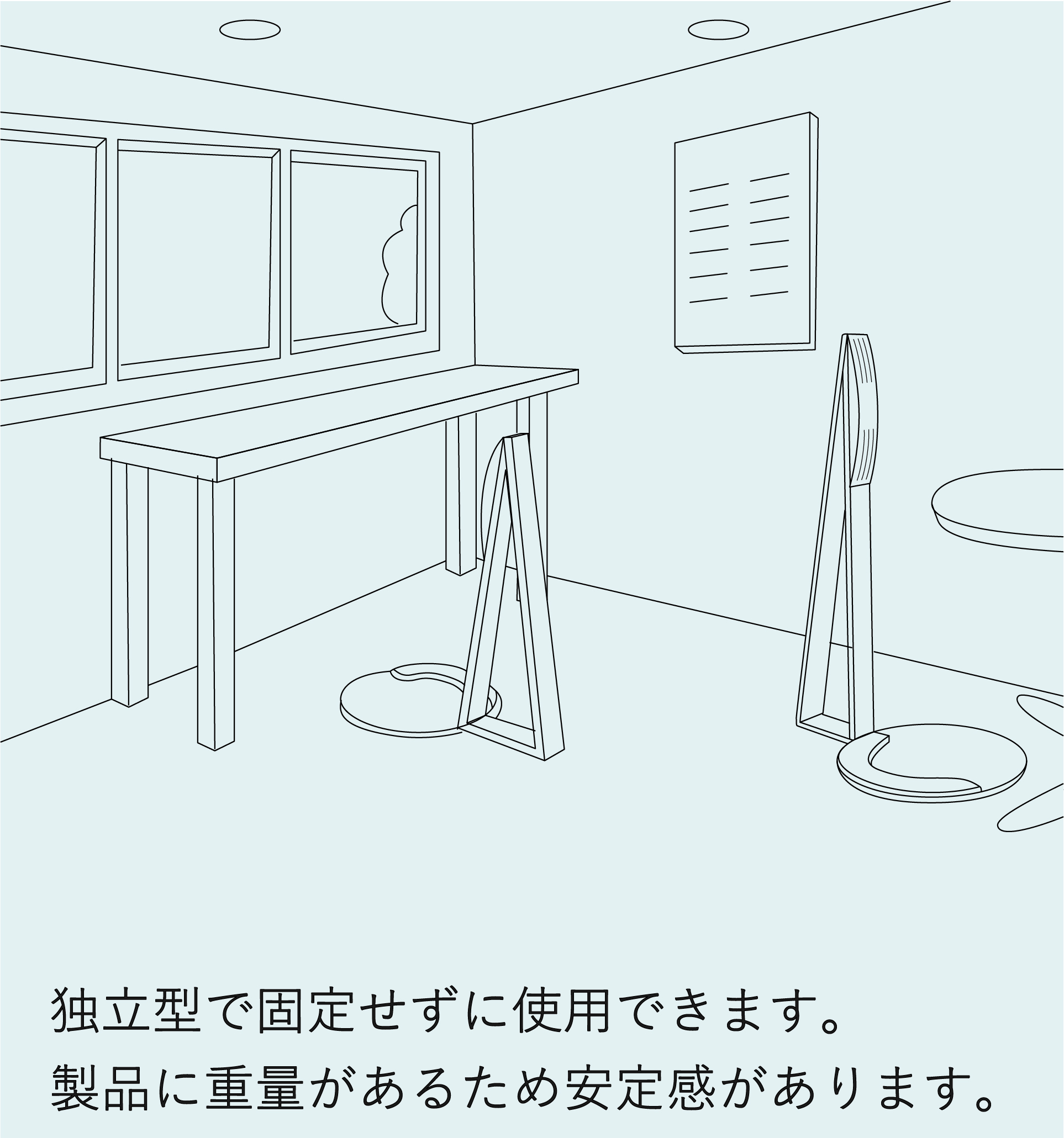 自立型でさまざまな場所に置いていただけます。